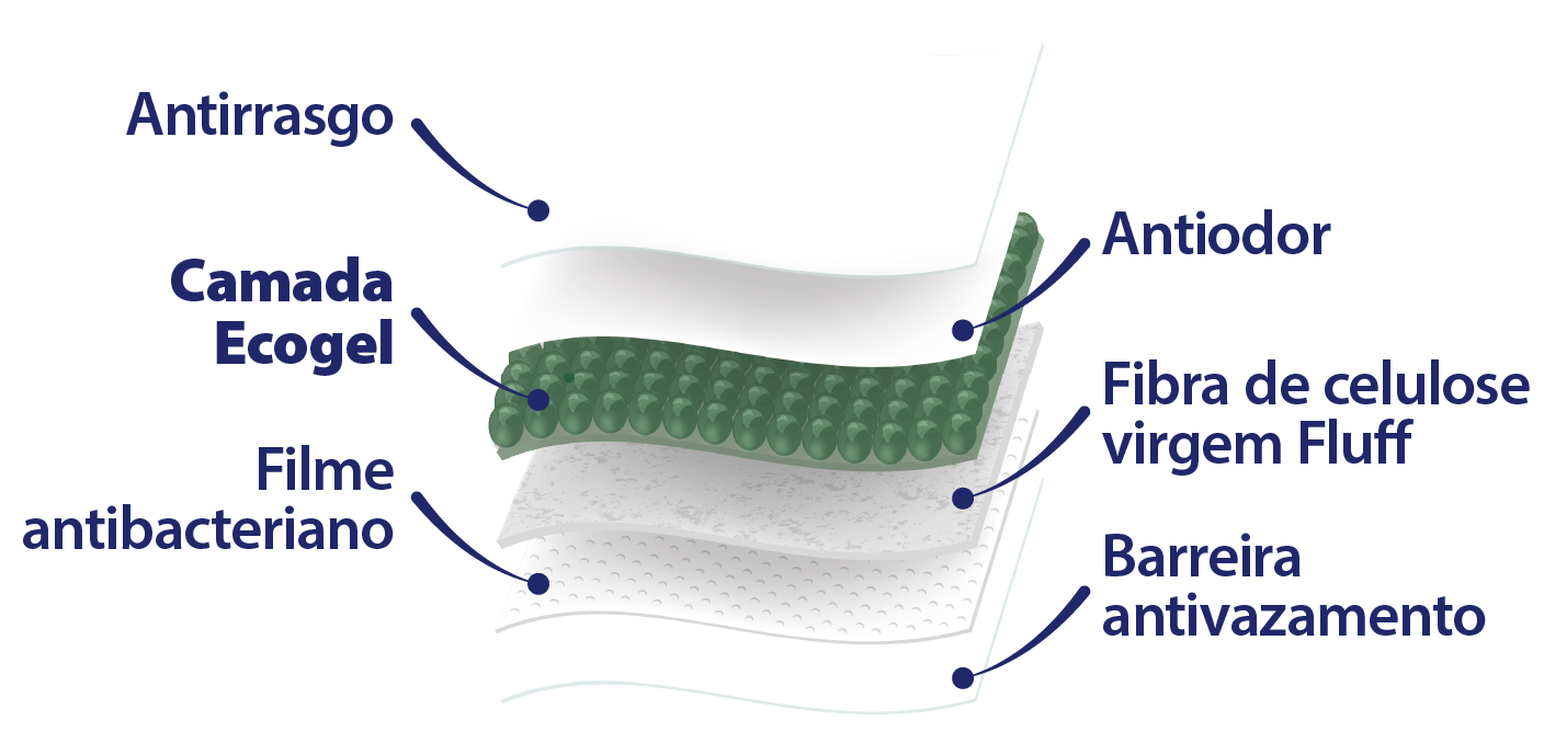 Fibra natural de origem vegetal, obtida da polpa de madeira virgem, presente na camada intermediária do tapete (entre o TNT e o EcoGel System), responsável pela distribuição uniforme da urina, espalhando o líquido lateralmente, evitando acúmulo em um único ponto e potencializando a eficiência do gel.